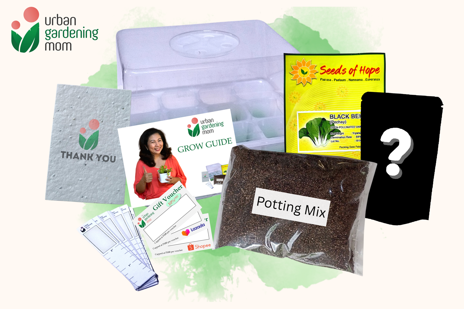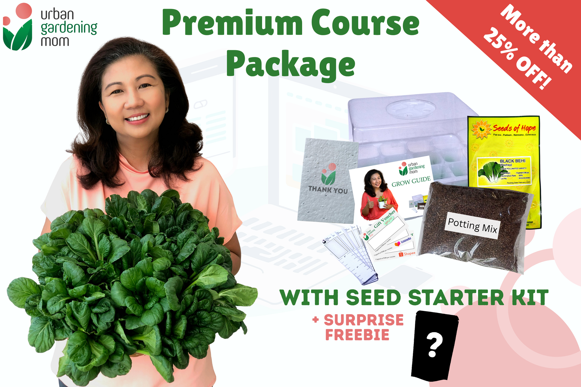 The Premium Package contains (1) Full Access to the Online Digital Course consisting of 5 Chapters; (2) 3x Gift vouchers to avail of a 10% discount (capped at P100 per voucher); (3) A Seed Starting Kit, containing a seed tray with dome, seed pack, seed starter mix and various other freebies.