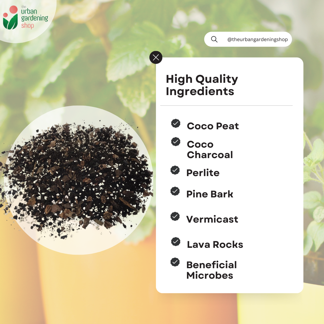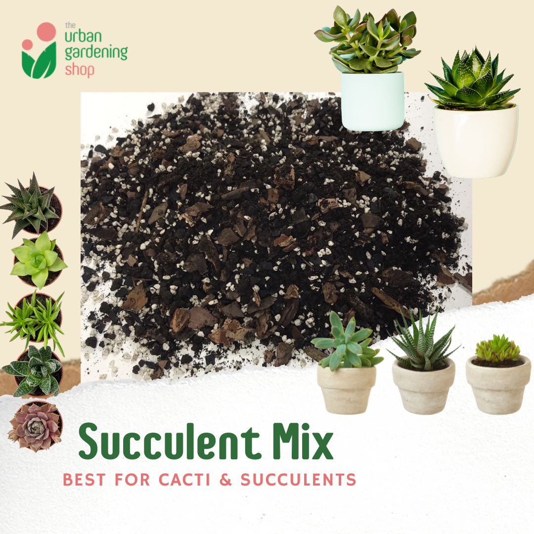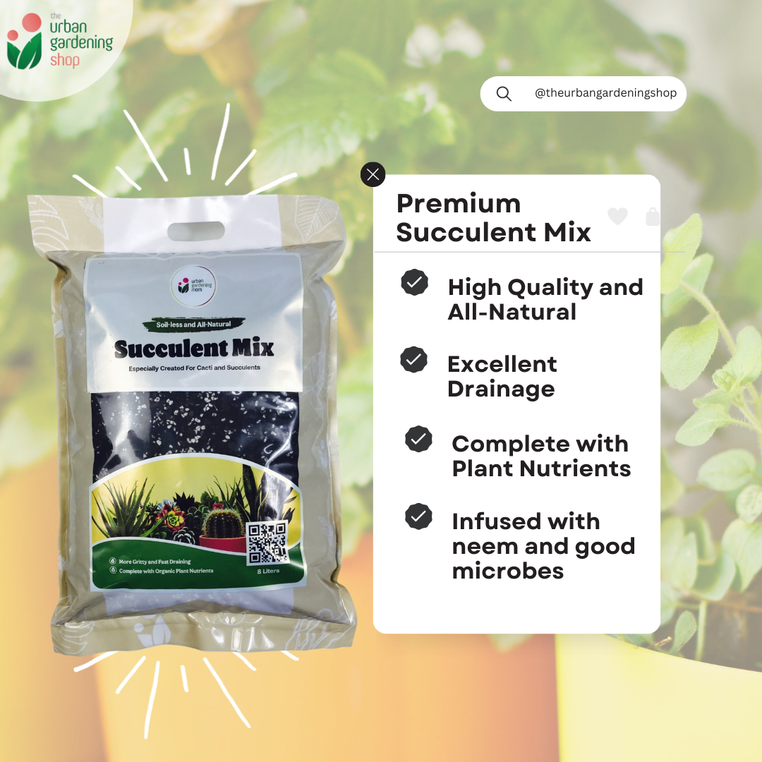 Our succulent mix is composed of premium organic materials, that include composted coco peat, pine bark, and carbonized rice hull (or charcoal, if available). Inorganic materials (about 50%) include perlite, lava rocks and pumice. We have also infused neem and beneficial microbes which help protect the roots from root-bound pests or from harmful pathogens. We have also added vermicast, an organic plant nutrient made from worm castings. Vermicast acts like a slow -release fertilizer which provide succulents plants with a balanced source of basic nutrients.